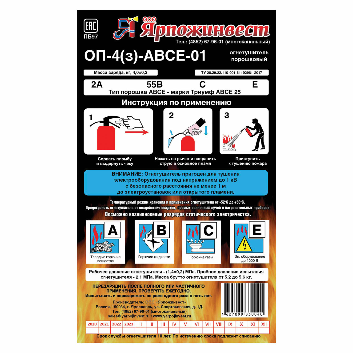 - Огнетушитель порошковый ОП-4, АВСЕ (твердые, жидкие, газообразные вещества, электрические установки) закачной, ЗПУ Алюм, ЯРПОЖ, УТ-00001651