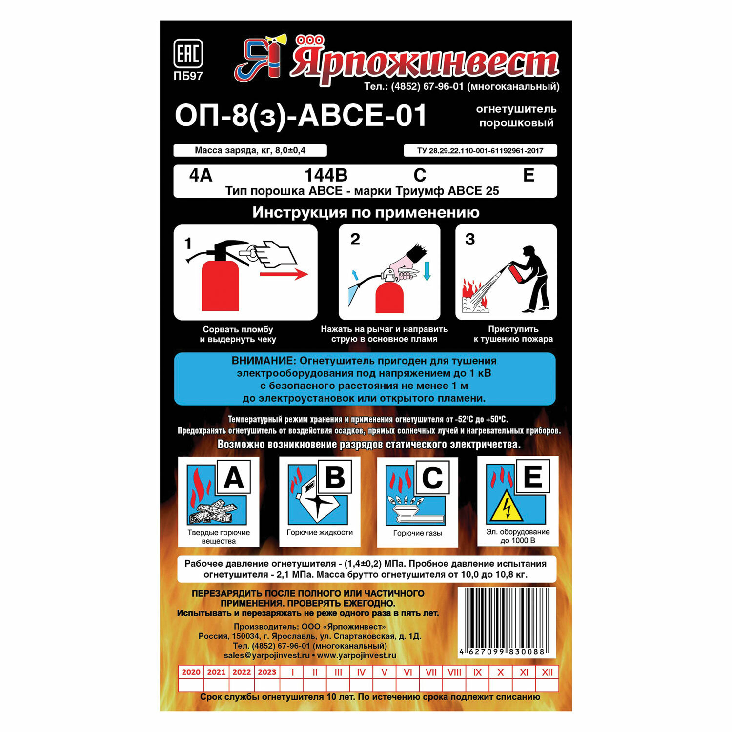 Огнетушитель порошковый ОП-8, АВСЕ (твердые, жидкие, газообразные вещества, электрические установки) закачной, ЗПУ Алюм, ЯРПОЖ, УТ-00001691