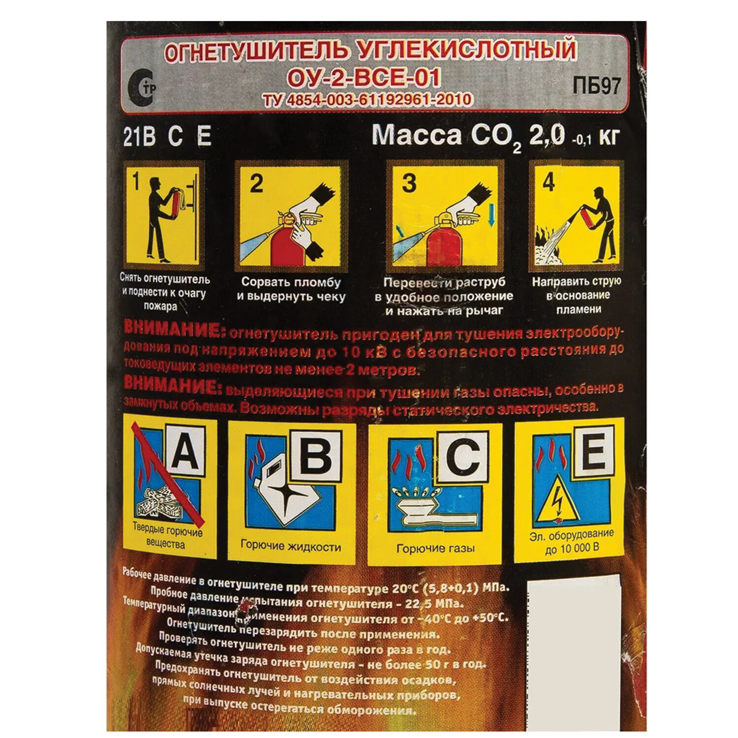 2. После использования огнетушителя в закрытом помещении необходимо проветривание. В противном случае возможно отравление парами углекислоты.