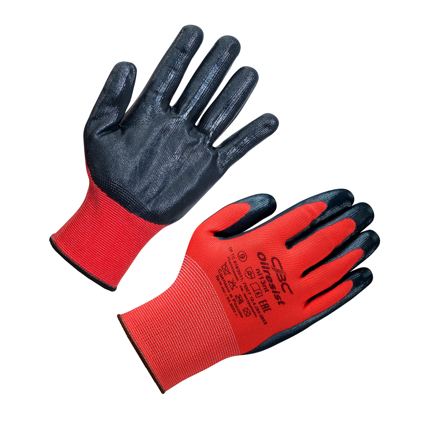 - нефтеперерабатывающая промышленность. Перчатки полиэфирные ОИЛРЕЗИСТ маслобензостойкие 1 пара, 15 класс, 42-44 г, размер 9, покрытие - облив НИТРИЛОВОЕ, прочные, тактильные, СВС, nl13nt крас/чер