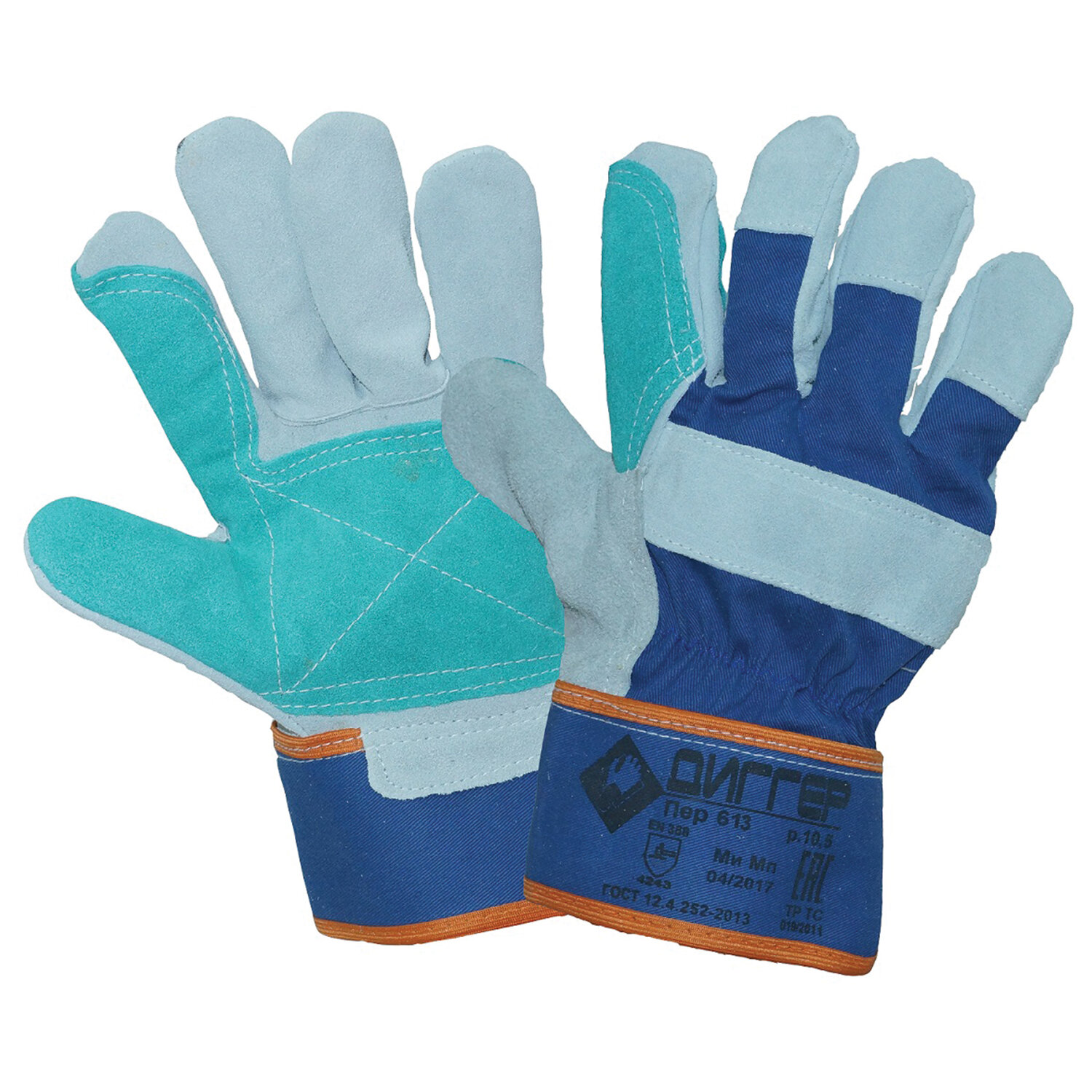 - Перчатки спилковые комбинированные ДИГГЕР, усиленные, размер 10,5 (XL), серый/зеленый, ПЕР613