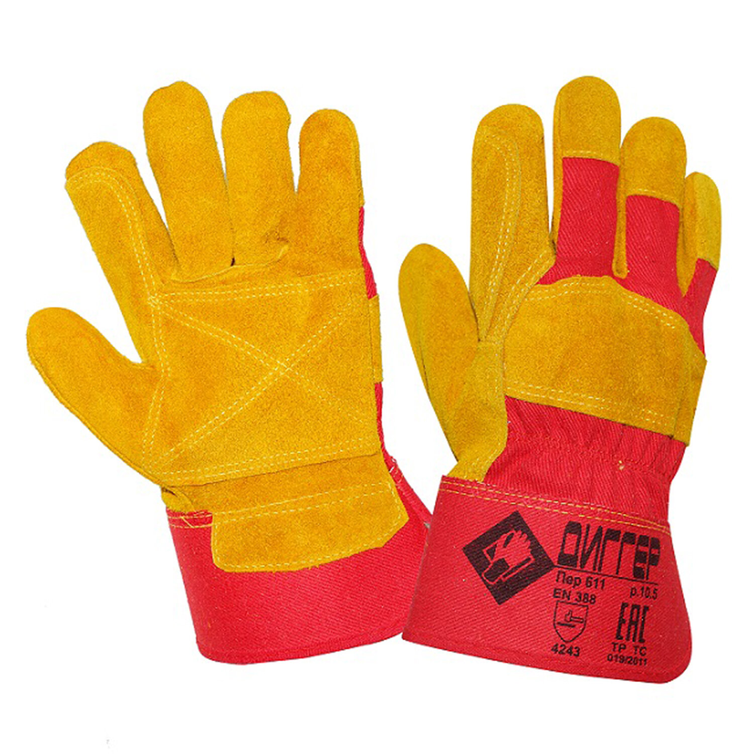 Перчатки рекомендованы для продолжительного ношения, могут быть использованы при проведении общих работ для защиты от механических воздействий в отсутствие жидких загрязнителей, таких как масло, водные растворы и т.д., для защиты рук от ОПЗ, истирания, при работе с абразивами. Размер 10,5. Перчатки спилковые комбинированные ДИГГЕР, усиленные, размер 10,5 (XL), желтые/красные, ПЕР611