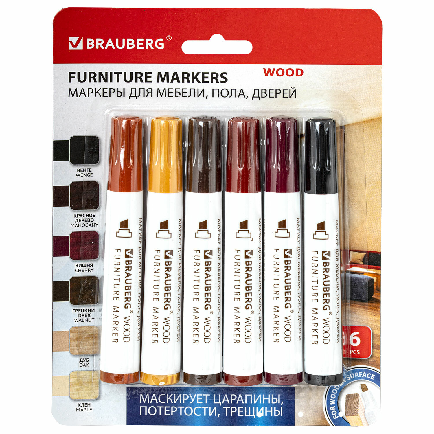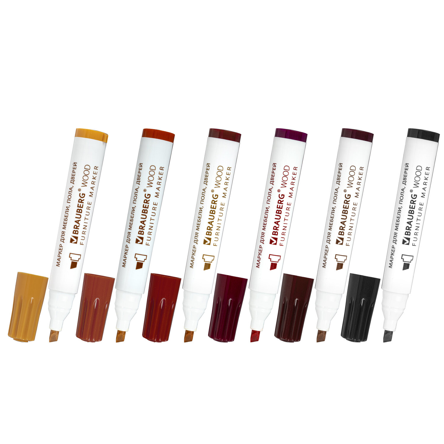 Набор маркеров для мебели из 6 цветов (венге, красное дерево, вишня, грецкий орех, дуб, клен) предназначен для маскировки царапин и сколов на мебели, напольном покрытии, дверях и других изделиях из дерева. Маркер обладает круглой формой корпуса из пластика, диаметр которого 19 мм. Скошенный наконечник позволяет наносить краску со штрихом от 1 до 5 мм. Особая нестираемая основа краски обеспечивает такие качества, как стойкость к воздействию воды, ультрафиолету, низких и высоких температур. Благодаря спиртовой основе краска быстро сохнет, что позволяет наносить несколько слоев за короткий промежуток времени. Изделие не перезаправляется. Плотно закрывается колпачком, что предотвращает высыхание наконечника и чернил. Цвет колпачков соответствует цвету чернил. Маркеры для ремонта мебели и изделий из дерева, 6 ЦВЕТОВ, BRAUBERG WOOD, 152203