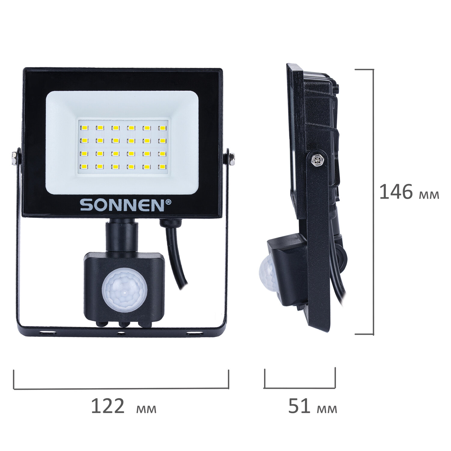 - Прожектор светодиодный с датчиком движения 20 Вт, 6500 К, 1600 Лм, 20 м2, IP65, 122х146х51 мм, черный, SONNEN, 238416