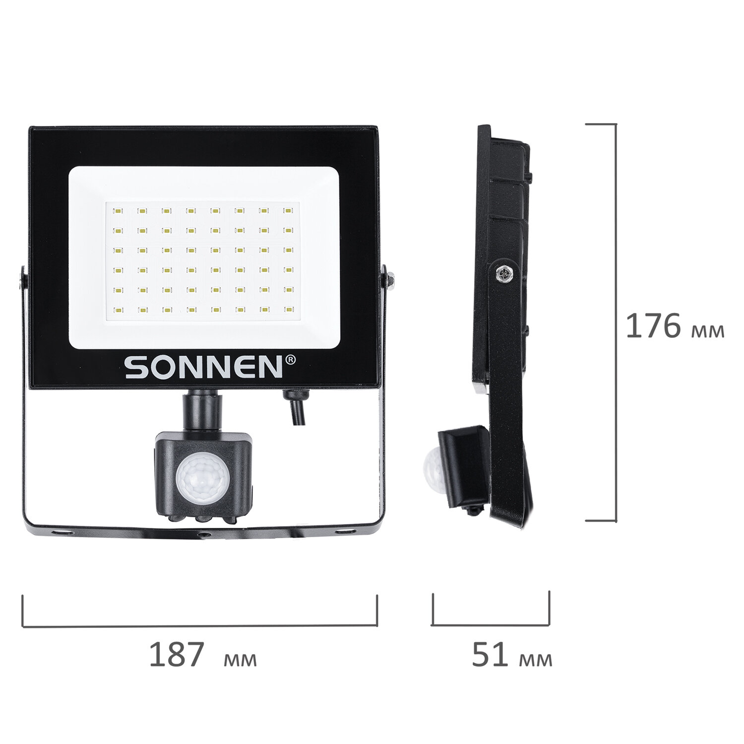 - Прожектор светодиодный с датчиком движения 50 Вт, 6500 К, 4000 Лм, 50 м2, IP65, 187х176х51 мм, черный, SONNEN, 238418