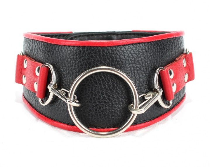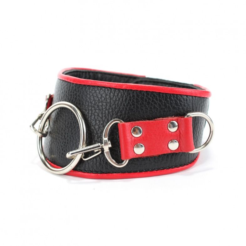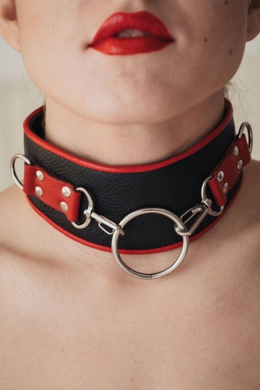 Ошейник выполнен из качественной натуральной кожи черного цвета . Аксессуар декорирован металлическим кольцом на двух карабинах, вставками из красной кожи, заклепками. Ошейник фиксируется металлическими кнопками, позволяющими подобрать нужный размер, подойдет на обхват шеи от 30 до 36 см. Мягкий подклад обеспечивает комфорт, помогая полностью погрузиться в БДСМ игру. Ширина - 6 см. Черно-красный кожаный ошейник с кольцом