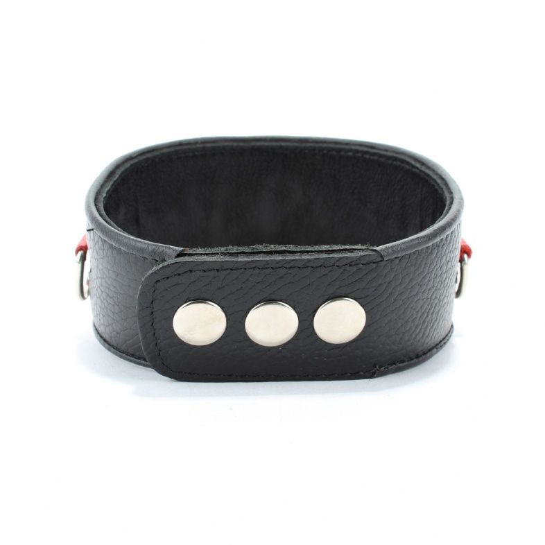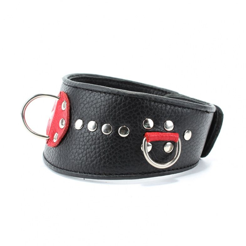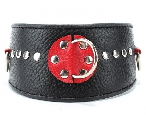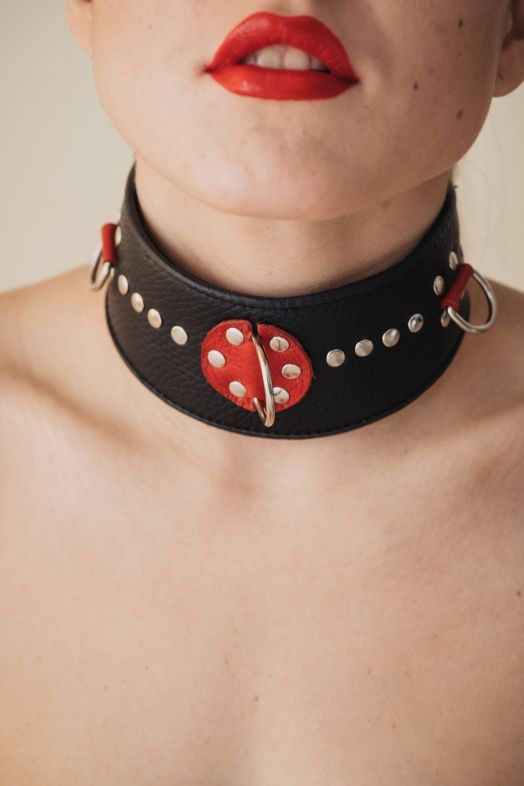 Ошейник с расширением впереди выполнен из качественной натуральной черной кожи, мягкий и комфортный в использовании. На изделии находятся три сварных полукольца. Аксессуар декорирован металлическими заклепками и вставками из красной кожи. Ошейник фиксируется металлическими кнопками, позволяющими подобрать нужный размер, подойдет на обхват шеи от 30 до 36 см. Стильный аксессуар поможет воплотить эротические фантазии в реальность. Ширина - 6 см. Черно-красный кожаный ошейник с металлическими клепками