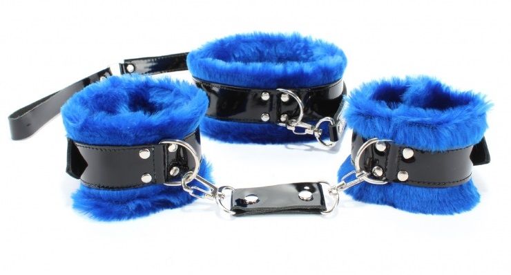 Черно-синие меховые наручники и ошейник с поводком