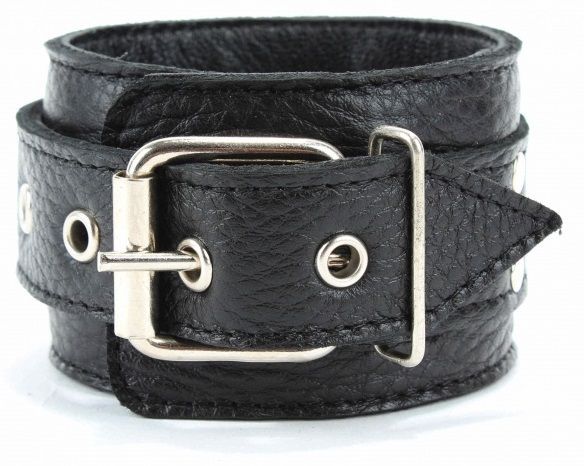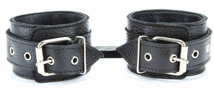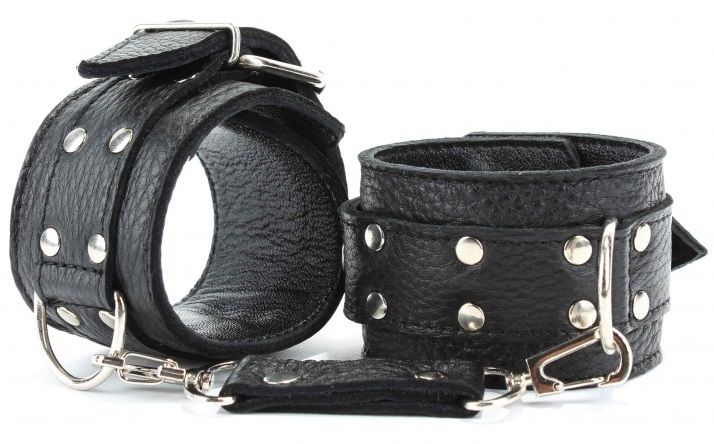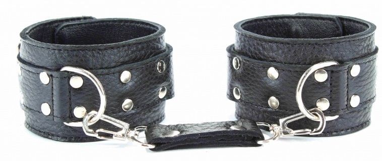 Наручники выполнены из натуральной кожи черного цвета. Изделие декорировано заклепками. Посередине расположено полукольцо из сварной фурнитуры. Наручники надежно фиксируются пряжками и ремнями, позволяющими выбрать нужный размер, подойдут на обхват руки от 16 до 25 см. Кожаное соединение на карабинах фиксирует наручники вместе. Стильные наручники отлично подходят для воплощения эротических БДСМ игр. Ширина - 5 см. Длина соединения -15 см. Черные кожаные наручники с пряжкой