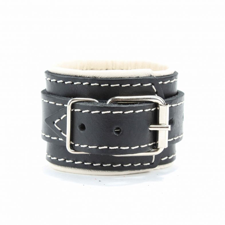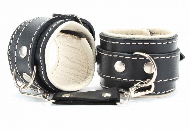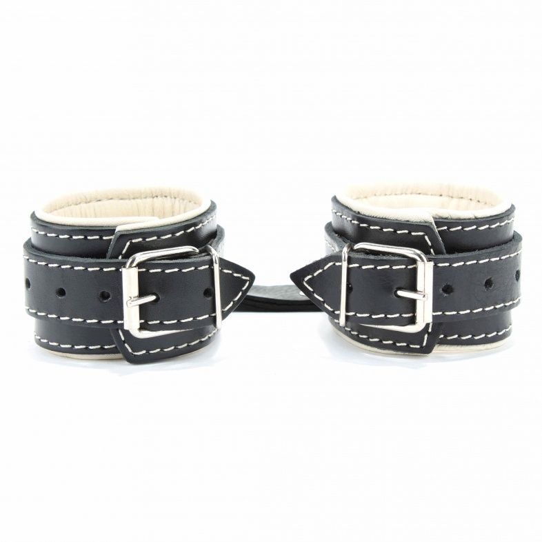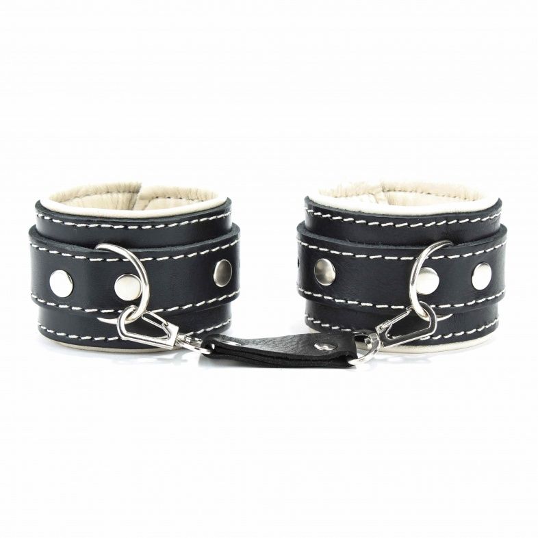 Наручники выполнены из толстой ременной кожи с подкладном из светло бежевой перчаточной кожи. Аксессуар декорирован светлой строчкой. Металлическая пряжка крепко удерживает в подчинении, кожаное соединение на карабинах фиксирует наручники вместе. Ремни позволяю выбрать нужный размер, подойдут на обхват от 18 до 25 см. Мягкий подклад обеспечивает комфорт, помогая полностью погрузиться в БДСМ игру. Ширина - 6 см. Длина соединения - 15 см. Черные наручники с бежевым подкладом