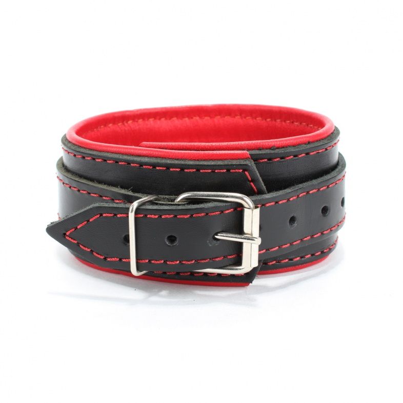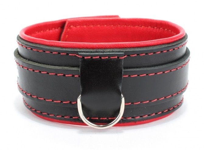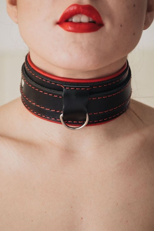 Ошейник выполнен из толстой ременной кожи с подкладном из красной перчаточной кожи. Аксессуар декорирован красной строчкой. Ремень позволяет выбрать нужный размер, подойдет на обхват от 28 до 36 см. Мягкий подклад обеспечивает комфорт, помогая полностью погрузиться в БДСМ игру. Ширина - 6 см. Черный ошейник с красным подкладом