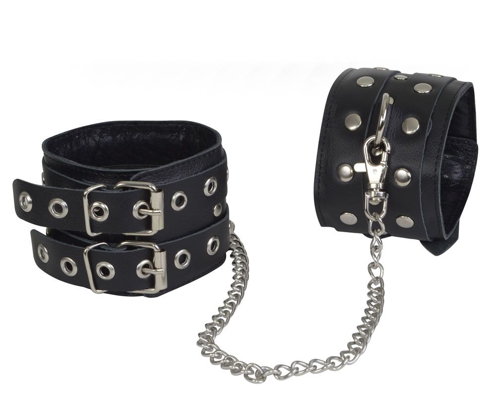 Изготавливаются из натуральной кожи с велюровой подкладой. При изготовлении использована фурнитура с никелевым покрытием. Между слоем основы и подкладой проложена мягкая прокладка. Соединяются между собой цепочкой с двумя карабинами на концах. Не нарушают кровообращение, надёжно фиксируются на щиколотках с помощью двух ремешков. Размер универсальный. Длина цепочки - 35 см. Чёрные кожаные оковы, соединенные цепочкой