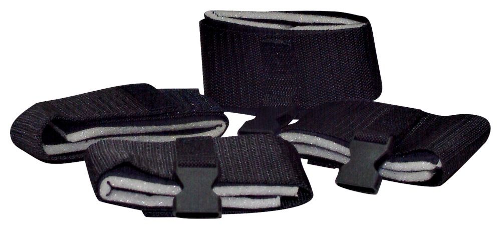 Комплект для связывания. В комплекте 2 черные ленты (длина каждой 320 см), которые соединяются под матрасом с лентами (длина 180 см) с подбитыми лентами для рук и ног, которые регулируются ремнем. Комплект для фиксации на кровати