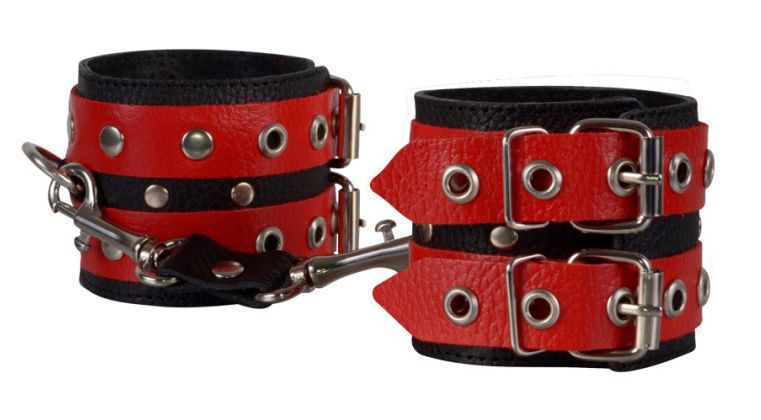 Изготавливаются из натуральной кожи с велюровой подкладой. При изготовлении использована фурнитура с никелевым покрытием. Между слоем основы и подкладой проложена мягкая прокладка. Соединяются между собой коротким ремешком с двумя карабинами на концах. Не нарушают кровообращение, надёжно фиксируются на запястьях с помощью двух ремешков. Размер универсальный. Красно-чёрные наручники из кожи