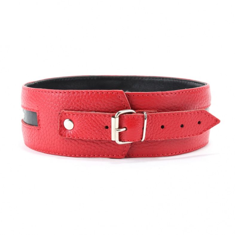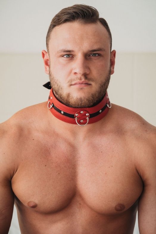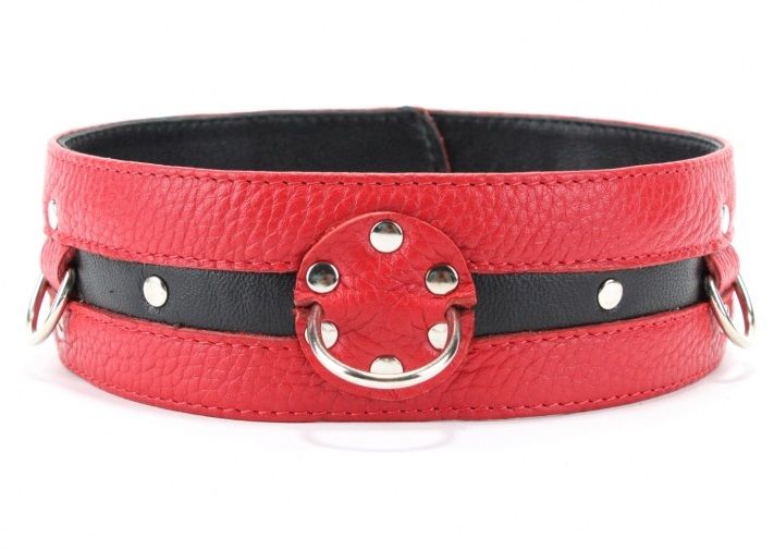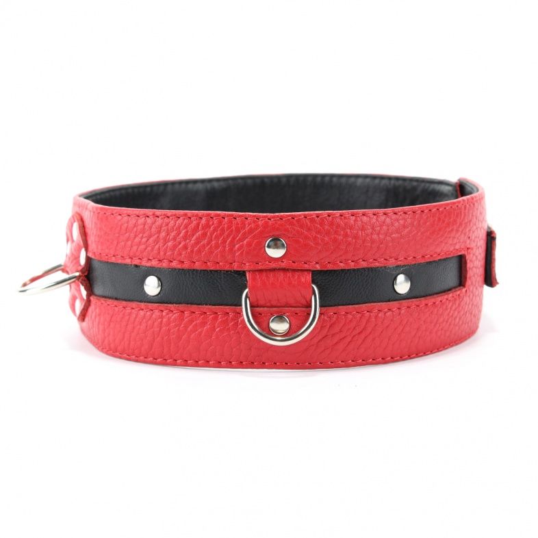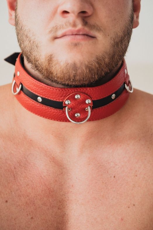 Ошейник выполнен из натуральной кожи красного цвета, декорирован вставкой из черной кожи, заклепками и тремя металлическими полукольцами. Ремень позволяет выбрать нужный размер, подойдет на обхват от 44 до 55 см. Металлическая пряжка надежно фиксирует, подклад из нежной кожи обеспечивает комфорт. Стильный аксессуар поможет воплотить эротические фантазии в реальность. Ширина - 5 см. Красно-чёрный кожаный ошейник увеличенного размера