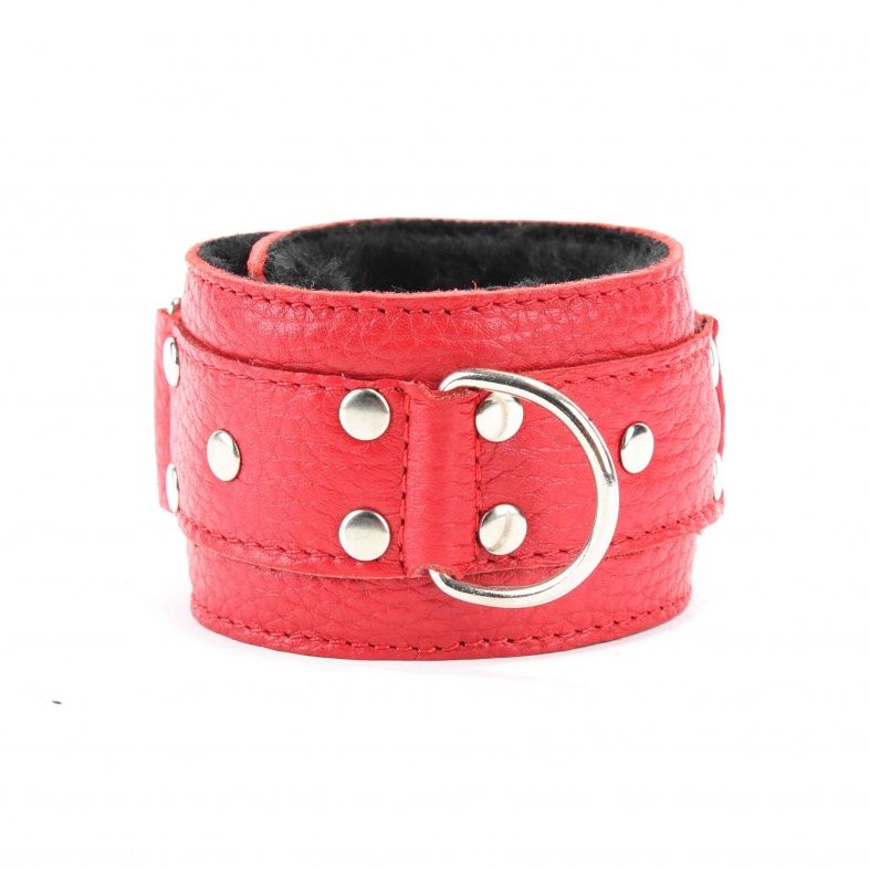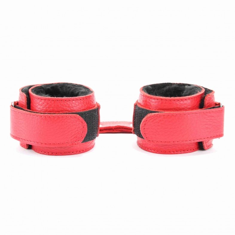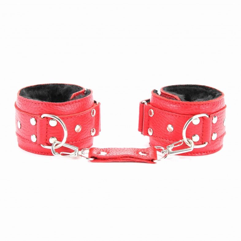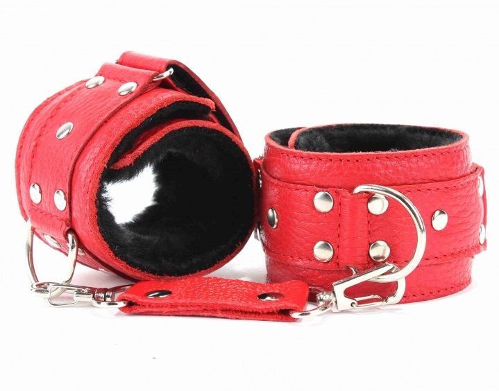 Наручники выполнены из красной натуральной кожи, легко, но надежно фиксируются красными ремнями на липучке, позволяя выбрать нужный размер, подойдут на обхват руки от 15 до 26 см. Аксессуар декорирован заклепками. Кожаное соединение на карабинах фиксирует наручники вместе. Мягкий подклад из меха обеспечит комфортное пребывание в образе, помогая полностью погрузиться в БДСМ игру. Ширина - 5,5 см. Длина соединения - 14 см. Красные кожаные наручники с меховым подкладом