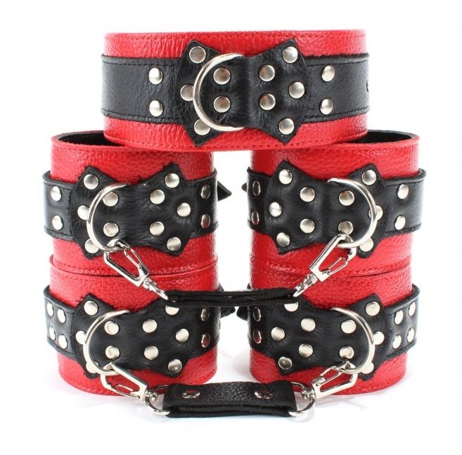 Набор состоит из наручников, оков, ошейника, выполненных из натуральной кожи красного цвета со вставками из черной кожи. Декор в виде банта с металлическим кольцом по центру на каждом изделии придает пикантности для самых смелых фантазий. Все составляющие надежно фиксируются ремнями и металлическими пряжками, позволяющими выбрать нужный размер. Ошейник подойдет на обхват от 29 до 39 см, оковы на обхват от 16 до 26 см, наручники на обхват от 15 до 24 см. Атрибуты можно скреплять по вашему желанию кожаными соединениями на карабинах. Ширина манжет - 6 см. Длина соединений - 14 см. Набор кожаных красно-черных БДСМ-аксессуаров