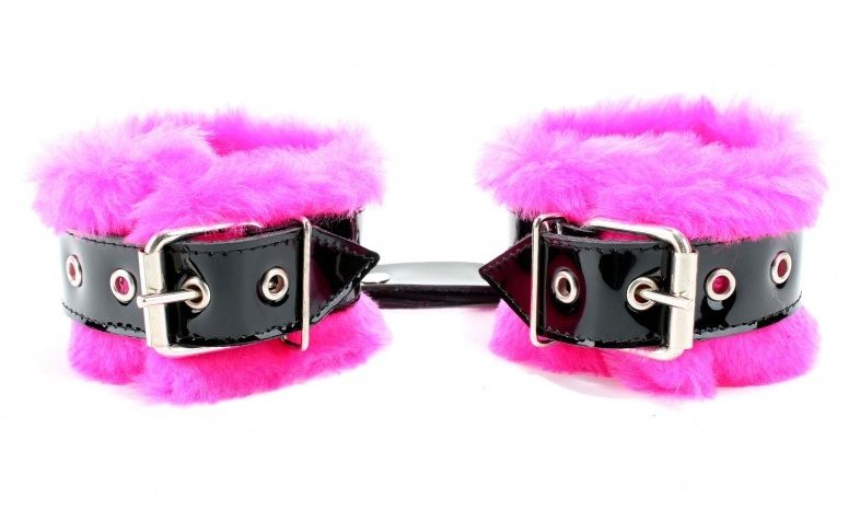 - Розовые меховые наручники с ремешками из лакированной кожи