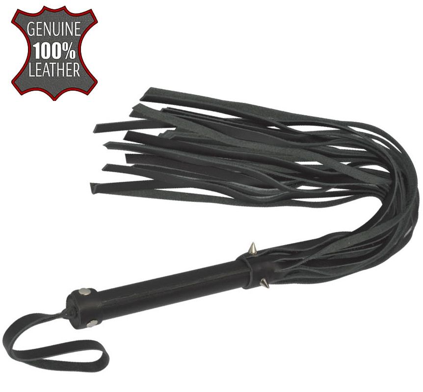 Плеть изготовлена из натуральной кожи и украшена тремя металлическими шипами. Черная большая многохвостая плеть с шипами - 55 см.