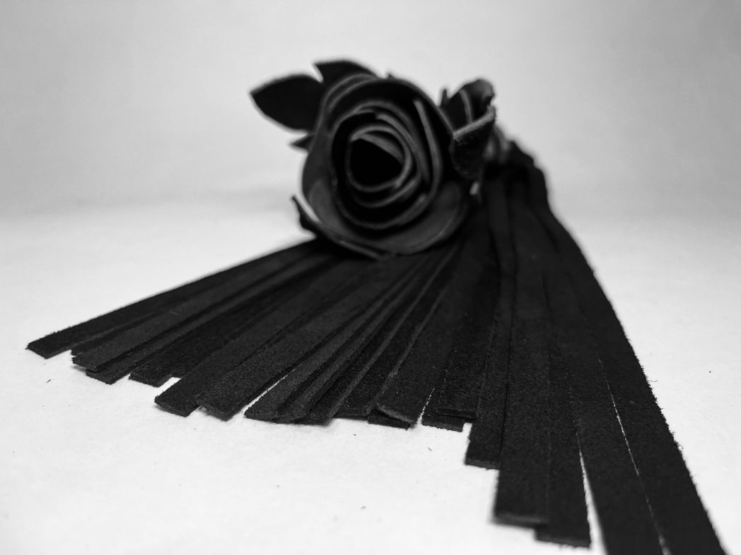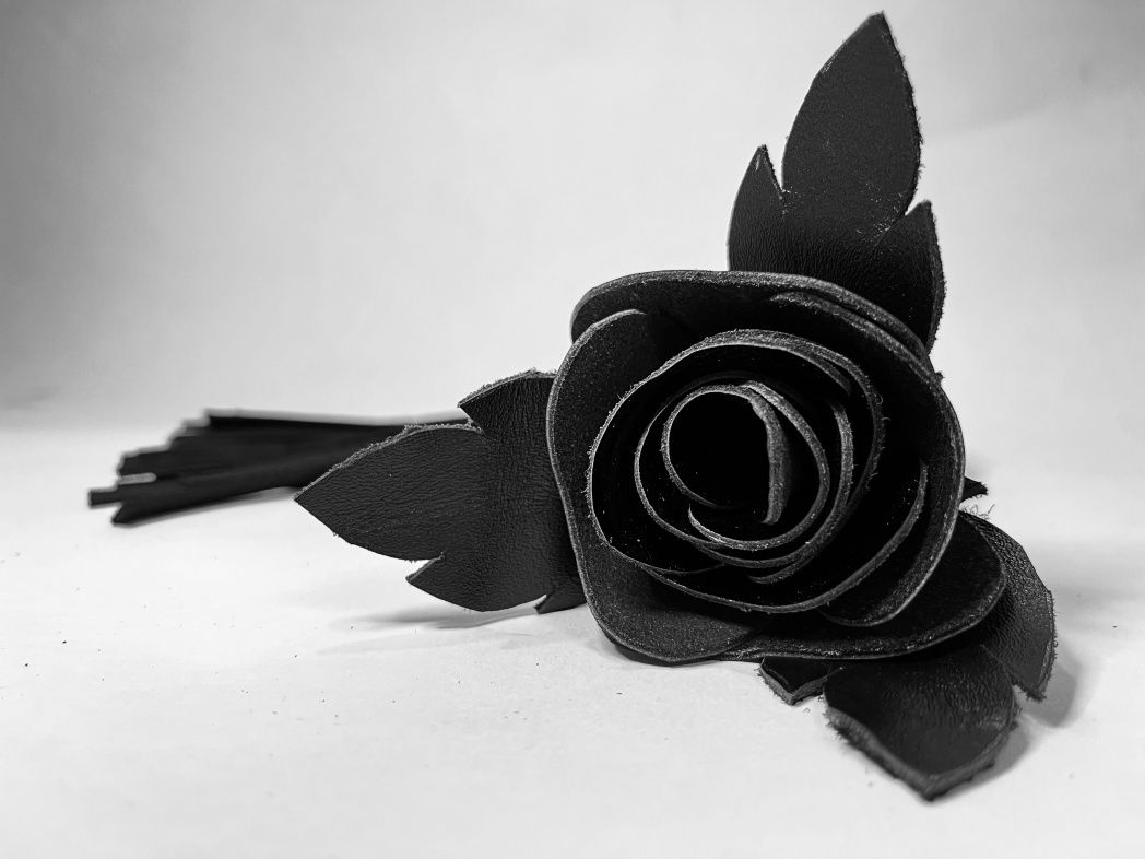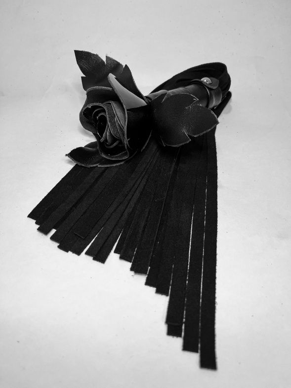 Восхитительная мини-плеть, украшенная чёрной розой. Цветок полностью выполнен из натуральной лаковой кожи, листочки розы и рукоятка выполнены из мягкой натуральной кожи, а хвосты плети - натуральная мягкая замша. Размеры этой плети очень изящны, поэтому данную плеть можно использовать, как генитальную, чтобы добавить новых ярких ощущений. Розочка очень удобно лежит в руке и создает неповторимую атмосферу и настроение, этот аксессуар никого не оставит равнодушным! Черная замшевая плеть с лаковой розой в рукояти - 40 см.