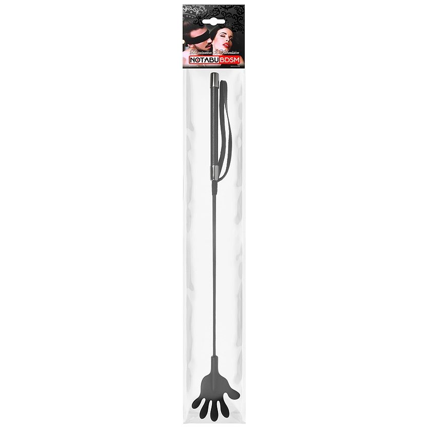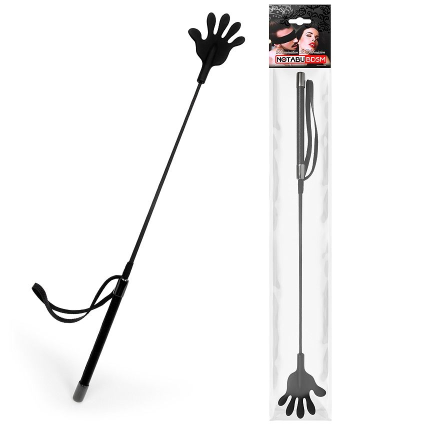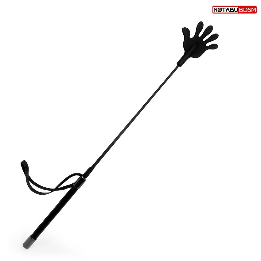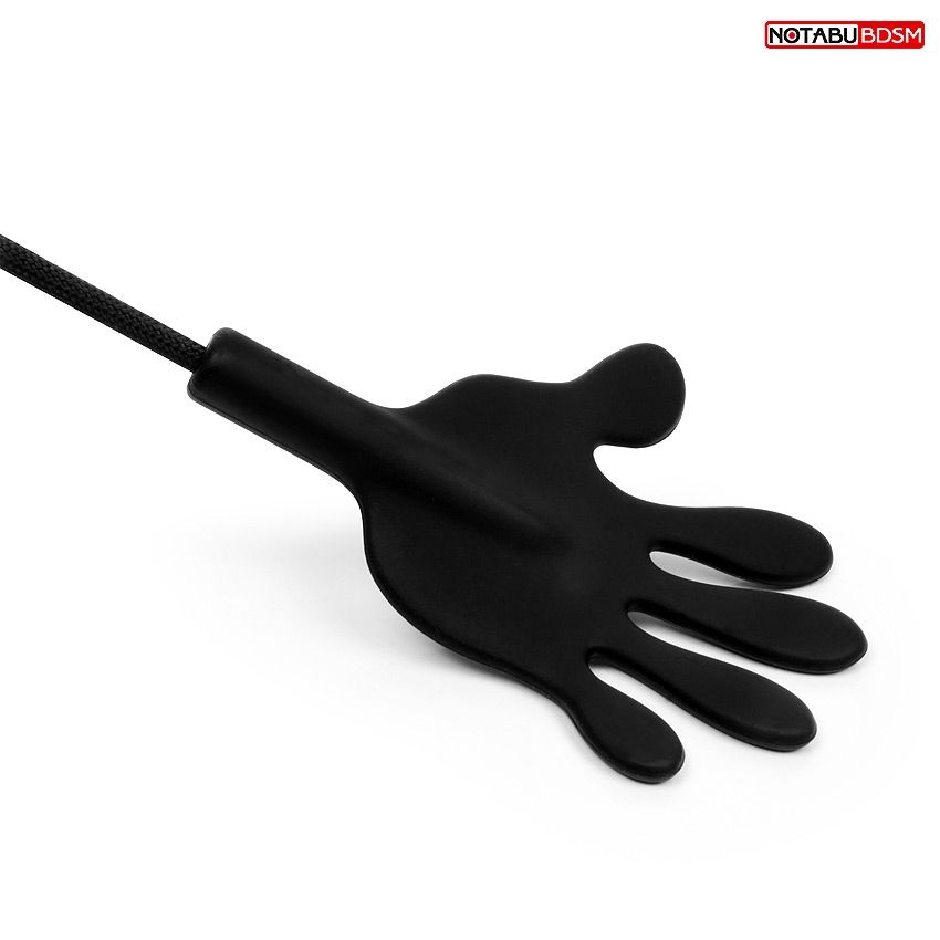Оригинальный стек для любителей БДСМ-развлечений. Рабочая поверхность в виде ладони и удобная ручка позволяют использовать его максимально эффективно. Интимный аксессуар идеально подходит для разогрева перед интимной близостью, а также в качестве элемента в ролевой игре. Ладонь изготовлена из упругого бархатистого материала. Ручка имеет текстильную оплётку. Рукоять отделана материалом под кожу и снабжена широкой петлёй. Изделие просто в применении, не требует сложного ухода. Черный стек с наконечником-ладошкой - 55 см.