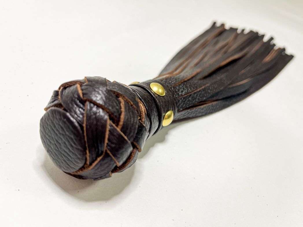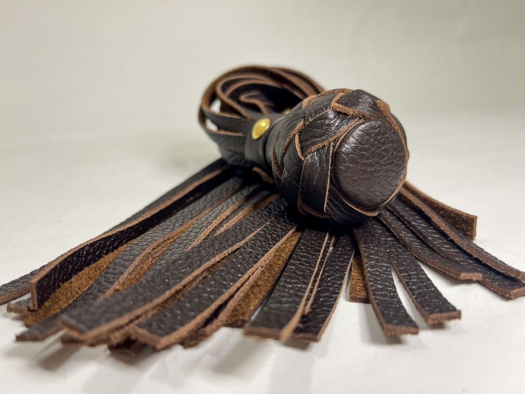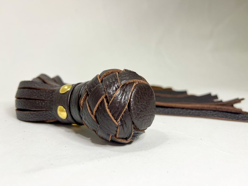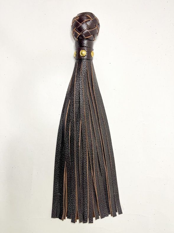 Изящная генитальная плеть, выполненная из натуральной кожи коричневого цвета. Мини-рукоятка декорирована плетением и металлической фурнитурой, очень комфортно ложится в руку! Общая длина аксессуара 30см. Плеть очень красивая, стоит только взять ее в руки, и уже не хочется отпускать. Эта малышка добавит огня и новых впечатлений в любовную игру! Коричневая генитальная кожаная плеть - 30 см.