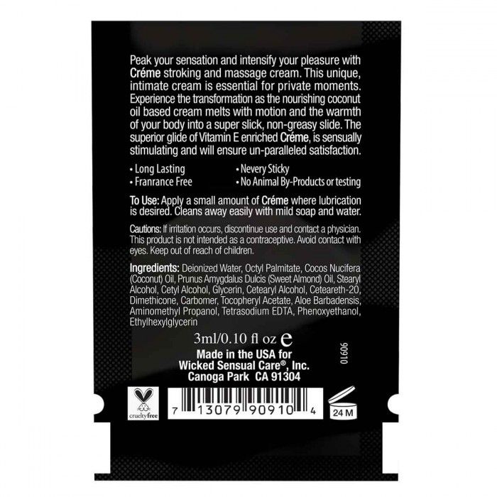 Разбудите свои ощущения и увеличьте удовольствие с кремом Wicked Stroking and Massage Creme. Этот уникальный крем без аромата для интимных поглаживаний и массажа на основе масла кокоса и сладкого миндаля идеально подходит для интимных моментов в одиночку или с партнером. Испытайте трансформацию, когда обогащенный питательный крем тает от тепла вашего тела и превращается в нежную жидкость. Превосходное скольжение этого обогащенного витамином Е крема чувственно стимулирует и обеспечивает непревзойденное удовлетворение. Веган продукт, не тестировавшийся на животных. Смывается мягким мылом и водой. Идеален для мастурбации, или массажа. Не использовать как лубрикант, только для внешней мастурбации. Крем для массажа и мастурбации Wicked Stroking and Massage Creme - 3 мл.