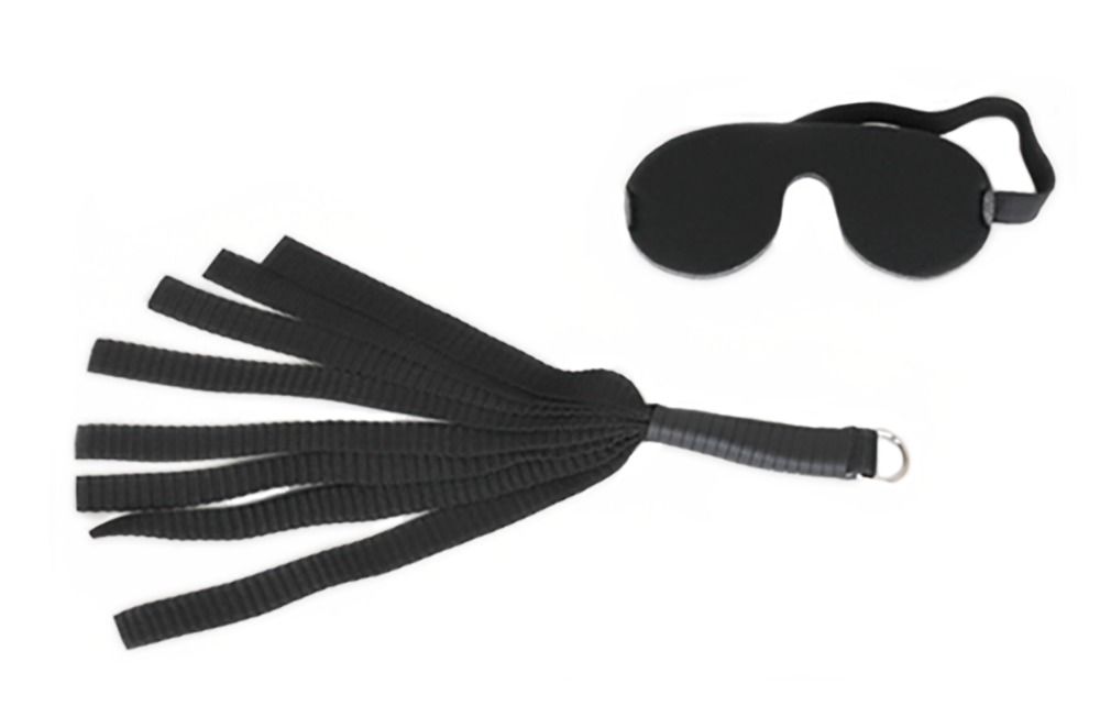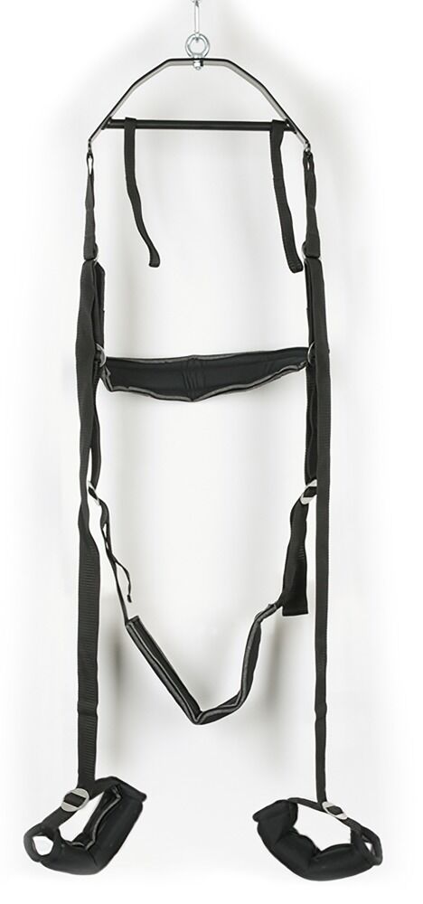 Черные секс-качели из широких ремней. Ремни регулируются по длине, чтобы вы могли настроить их для идеального расположения партнера. В комплекте маска на глаза и плеть. Выдерживают вес до 100 кг. Черные секс-качели из широких ремней